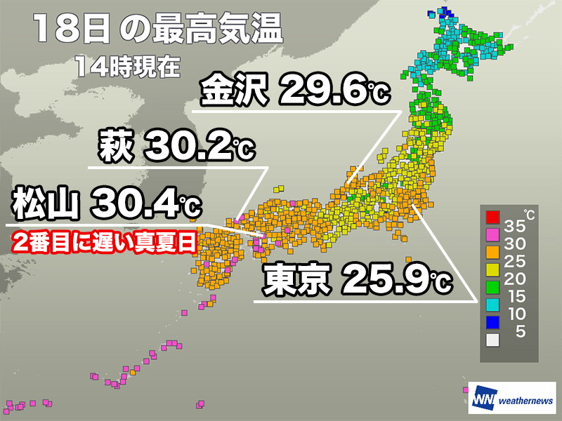 14時までの最高気温は鳥取県鳥取市・青谷で30.5℃、山口県萩市で30.2℃と真夏日を観測。金沢市も30℃に迫る29.6℃です。日差しが届いた九州や四国でも気温が高く、松山市では30.4℃と1906年10月24日に次ぐ、過去2番目に遅い真夏日になっています。