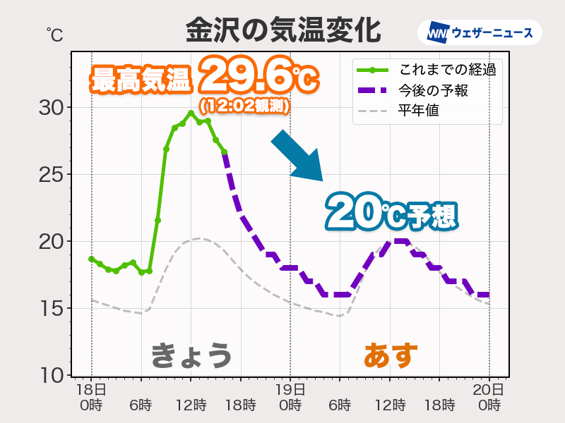 冷たい北風が吹き付ける日本海側は今日に比べて大幅に下がって、北陸では昼間でも20℃前後と肌寒くなります。