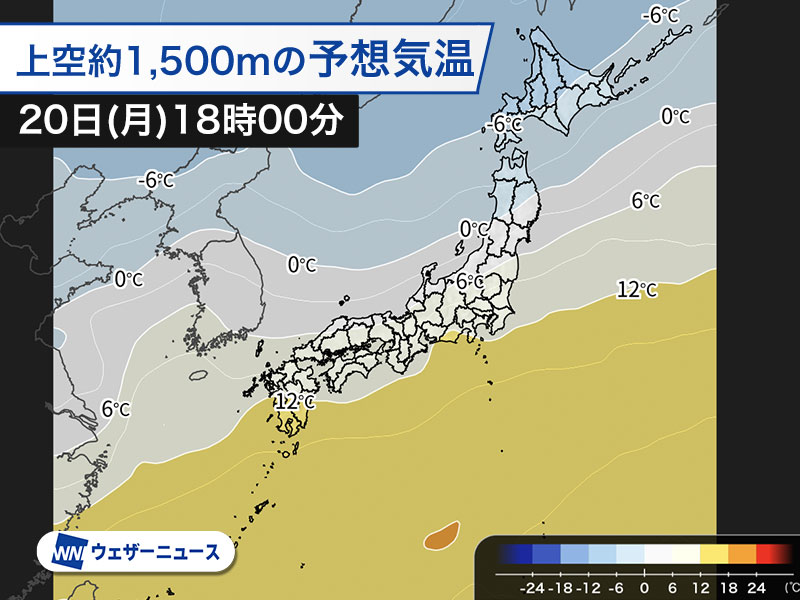 20日(月)から週後半にかけて、北海道付近には寒気が南下します。上空約1,500mで−6℃以下の寒気が道北付近を覆い、降水があれば平地でも雪になる可能性があります。