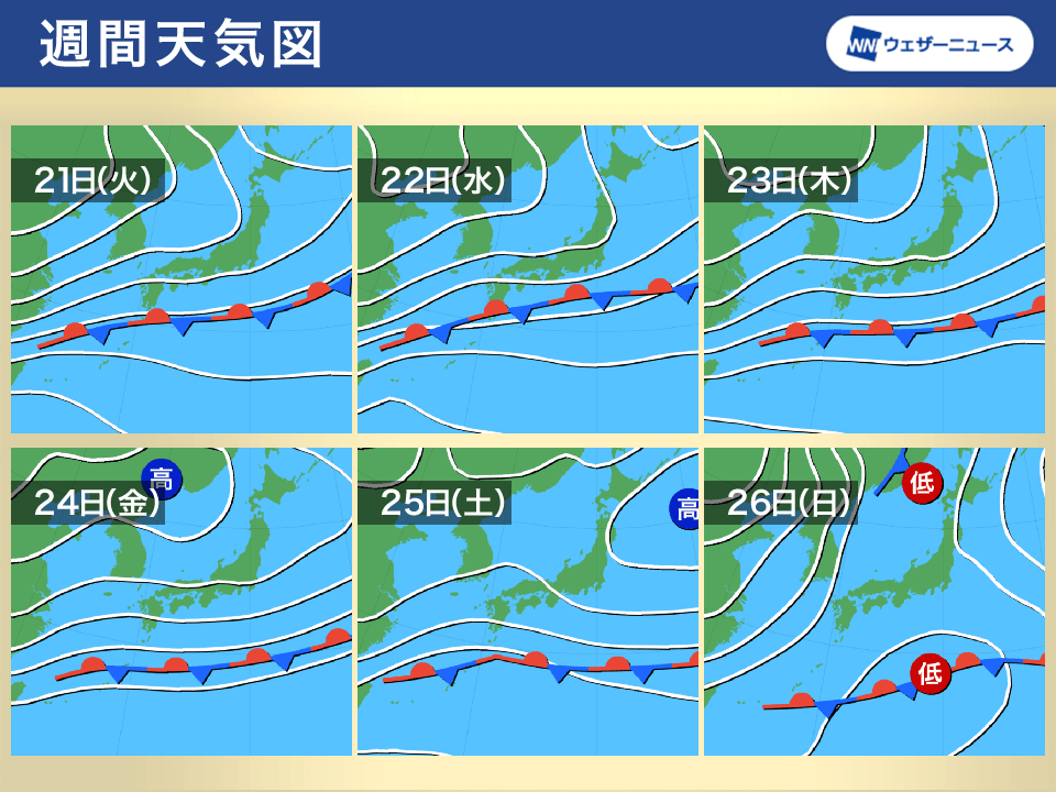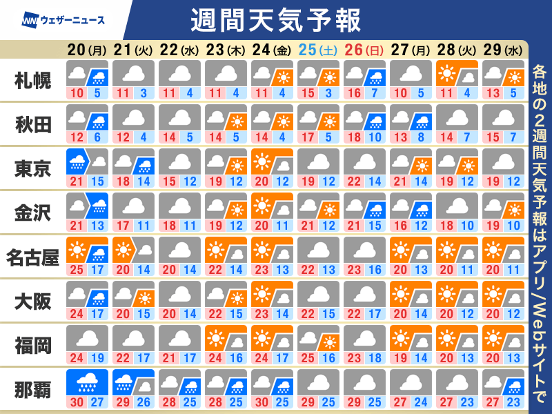 東日本や北日本では、晴れる日には朝の冷え込みも強まり、東京でも11月並みの10℃前後まで気温が下がる予想です。季節の変わり目ですので、体調を崩さないようお気を付けください。