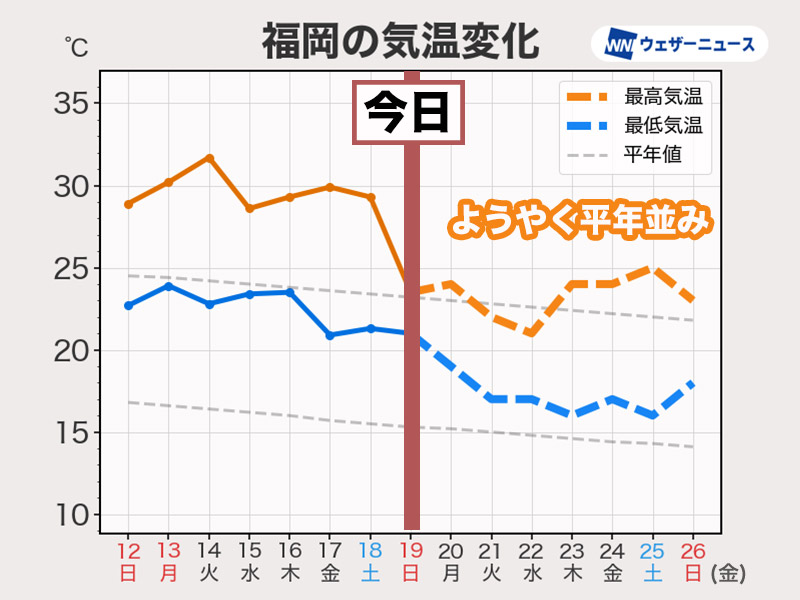 前線が南下したことで暖気の流れ込みが弱まり、これまで昼間は季節外れの暑さになっていた西日本も、ようやくこの時期らしい過ごしやすい気温になりそうです。東日本も一層秋らしさを感じられる日が多くなり、秋服が活躍します。