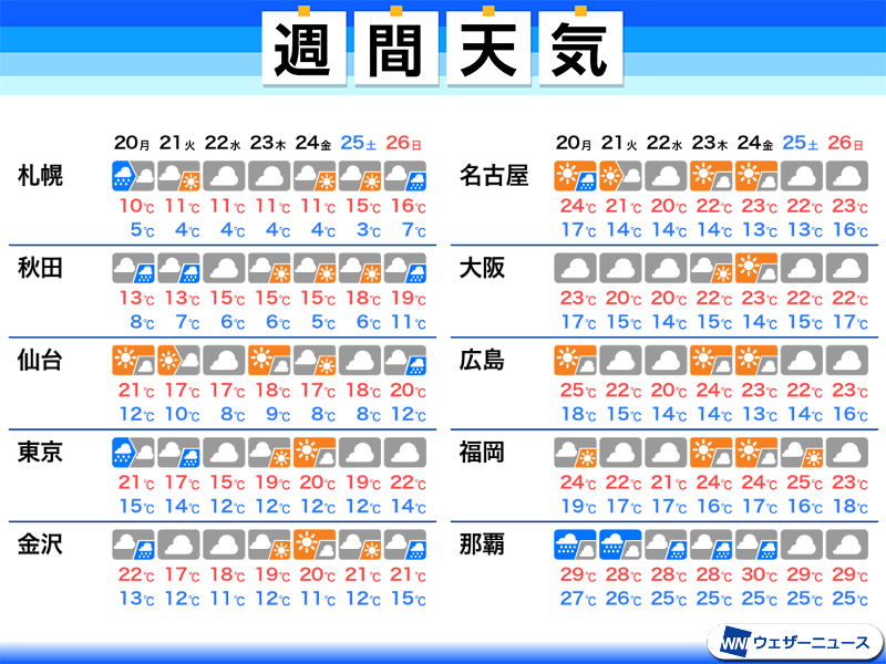 季節外れの暑さが続いていた西日本も、ようやく季節が前進します。晴れても25℃には届かない日が多く、秋服が活躍しそうです。朝晩は肌寒い日もありますので、体調管理を崩さないようお気をつけください。