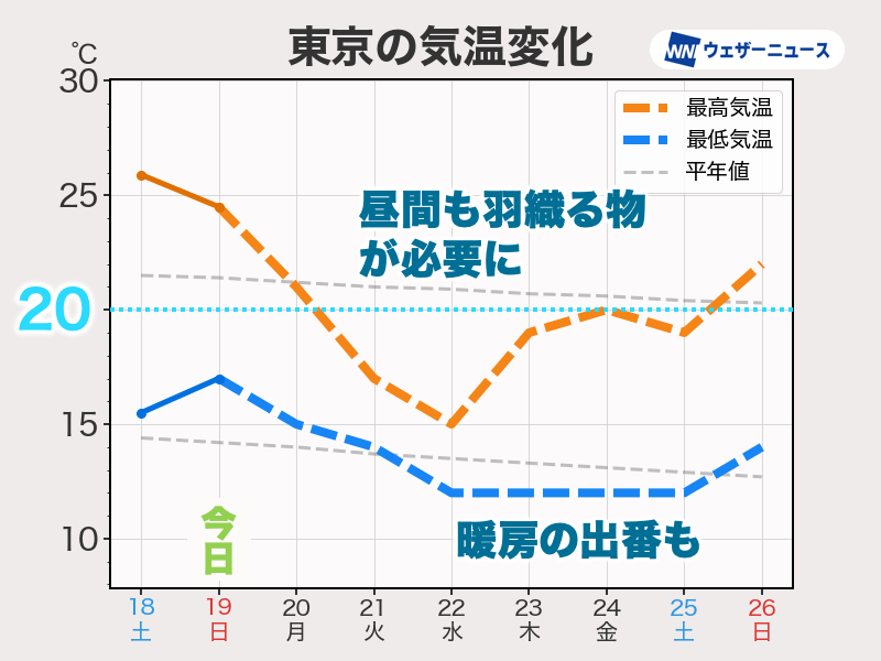 東京都心の気温変化を見ると、明日20日(月)から25日(土)にかけては最高気温が20℃に届かない日がほとんどになっています。22日(水)は15℃までしか上がらない予想で、昼間でも羽織る物が必要な肌寒さになる見込みです。