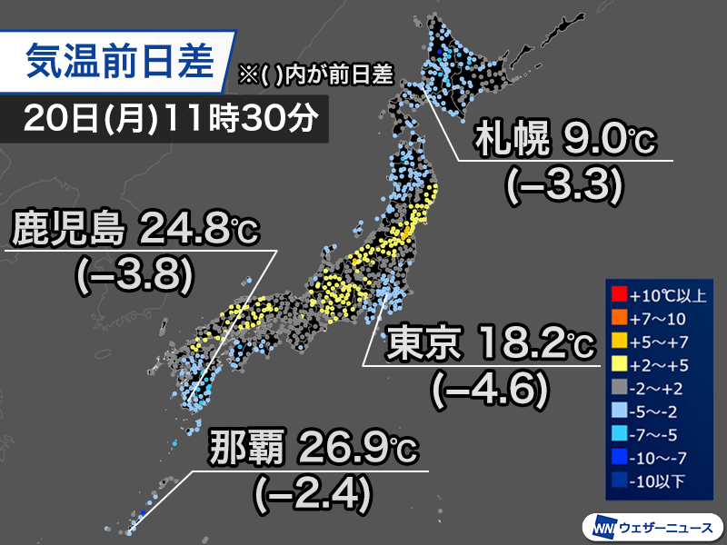 11時30分の気温は東京都心が昨日の同じ時刻に比べて4.6℃低い18.2℃、札幌市は3.3℃低い9.0℃、昨日は真夏日になった鹿児島市も3.8℃低い24.8℃に留まっています。