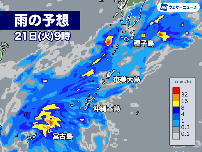 沖縄は雨雲の発達しやすい状況が続き、断続的に雨が降る見込みです。特に先島諸島では1時間に50mm以上の非常に激しい雨の降るおそれがあるため、道路冠水などに注意をしてください。