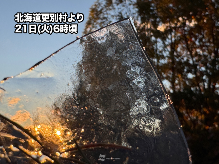 今朝の冷え込みによって、北海道の更別村では、氷が張った写真が撮影されました。今季から気象庁は官署や測候所での初霜・初氷の観測情報の発表を行わなくなりましたが、写真を撮影した方からは「初氷」とのコメントが添えられていました。
