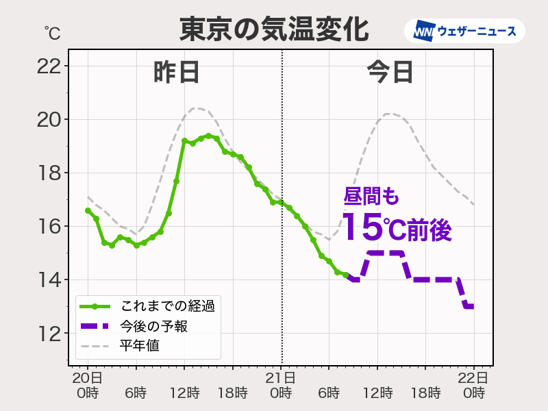 その他のところでも、11月並みの気温となるところが多く、上着がないと肌寒く感じられそうです。中でも関東周辺では朝よりも昼間のほうが気温が低く、東京都心では昼間でも15℃前後で推移する予想です。11月の終わりから12月の初め頃の気温となるので、暖かい服装で過ごすようにしてください。