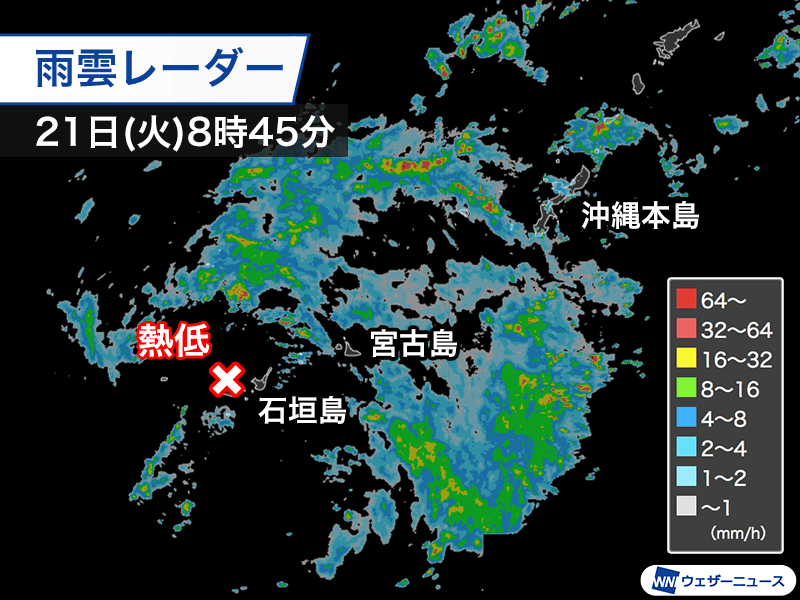 熱帯低気圧はこの後もあまり動きがなく、暖かく湿った空気の流入が続く見込みです。沖縄県渡名喜村では8時50分までの1時間に28.5mmの強い雨を観測しています。
