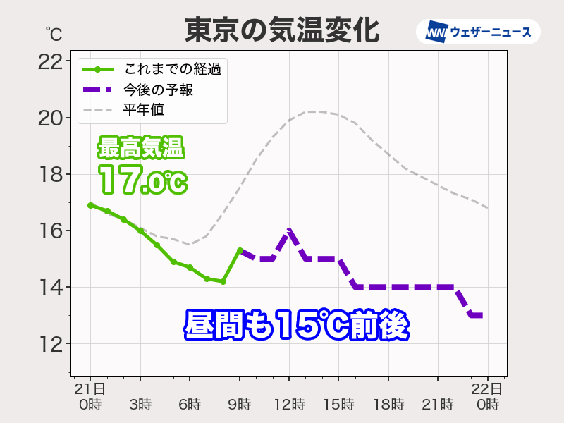 東京都心では0時35分に17.0℃を観測したあとジリジリと気温は下がっていて、7時47分に最低気温13.9℃を観測。9時00分の時点では15.3℃となっています。そのほかの関東各地も15℃に届くかどうかです。