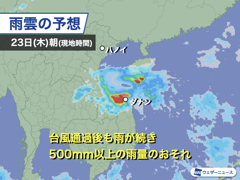 ベトナムでは明日22日(水)の夜から雨が強まるとみられます。台風の最接近のタイミングをピークに、その後も南シナ海からの湿った空気の流入が続くことで、24日(金)以降も断続的に強い雨が降る見込みです。