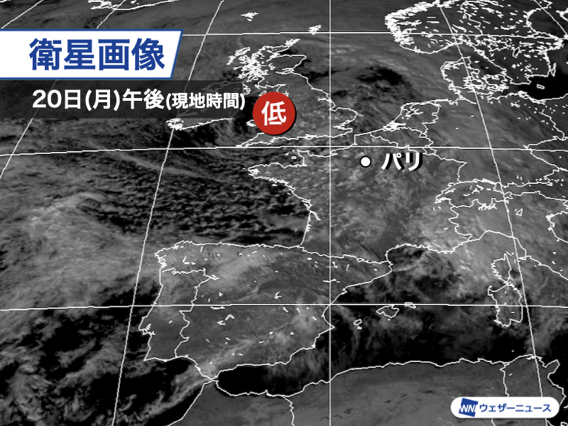 低気圧の動きが遅いため、フランスでは現地時間の21日(火)も雨雲の発達しやすい状況が続く見通しです。