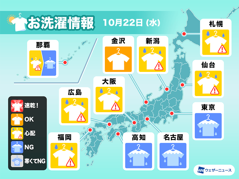 一方で北日本は冬のような気圧配置となるため、日本海側では室内干しがよさそうです。太平洋側は気温が低いながらも外干しができそうです。