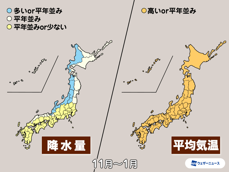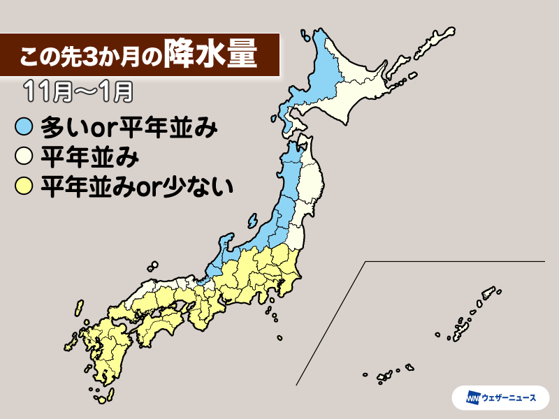 関東から西の太平洋側は平年並みか少ない予想で、特に12月は降水が少なくなるとみられます。空気が乾燥しやすいため、火災や感染症などへの注意が必要です。