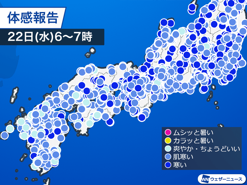 今日22日(水)の朝は、関東から東海、西日本の太平洋側を中心に昨日より低く、冬を思わせるような寒い朝を迎えています。