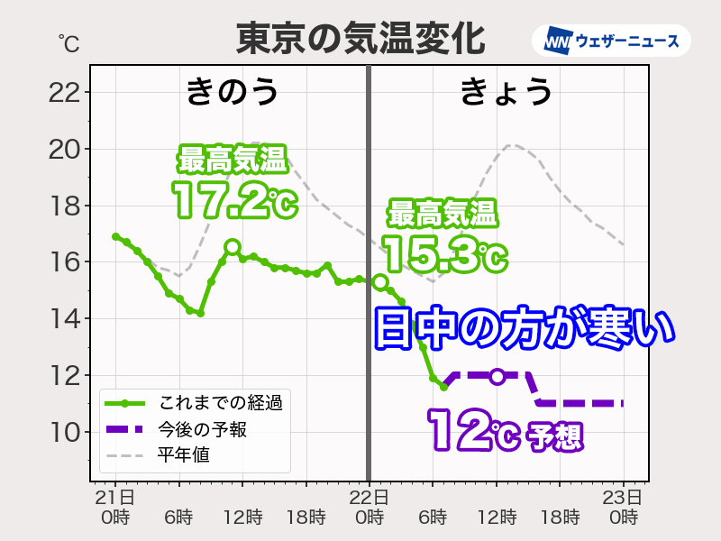 東京の予想最高気温15℃は今日の未明に観測されました。その後は右肩下がりで、日中は日差しが少ないため、12℃程度にとどまるとみています。