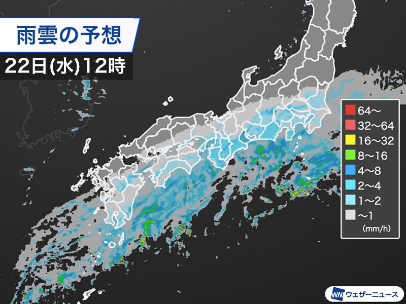 今日22日(水)は本州の南岸に停滞する前線の影響で、西日本や東日本の太平洋側を中心に曇りや雨のすっきりとしない天気となっています。