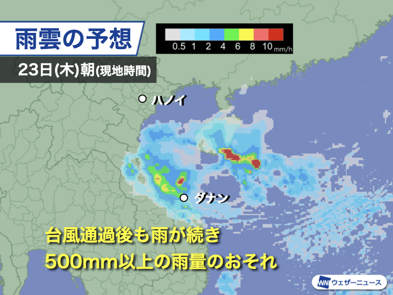 総雨量は中部の主要都市ダナンを含む多い所で500mm以上に達するおそれがあります。低地の浸水や土砂災害などの発生が懸念されるため、現地では警戒を強めています。