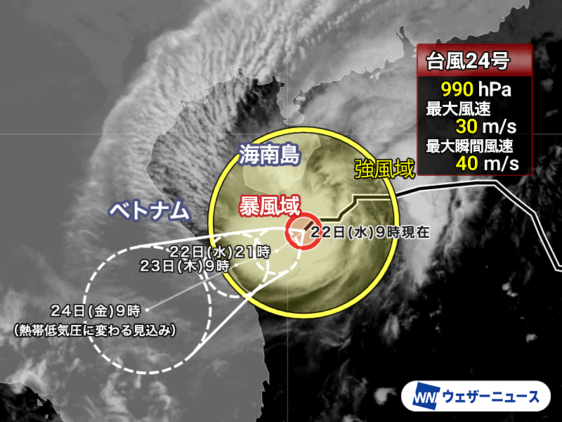 台風24号はやや勢力を強めて暴風域を伴いました。今後は南西に進んで、明日23日(木)の午前中にはベトナム中部に上陸する見込みです。