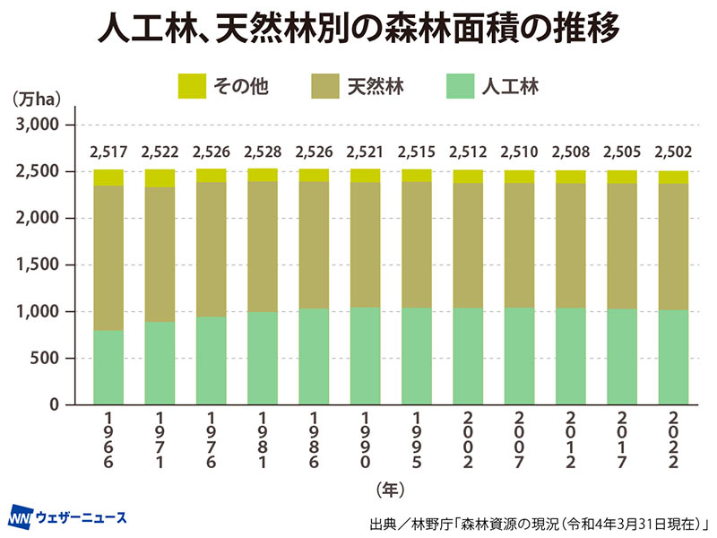 世界の森林面積が減少の一途をたどっている一方で、日本の森林面積はほぼ横ばいで推移しています。