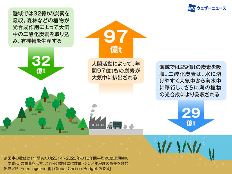 森林などの植物は、光合成によって酸素を生み出していると同時に、大気中の二酸化炭素を吸収し、減らしています。また、炭素を幹や枝、根、落ち葉や土壌に蓄えています。