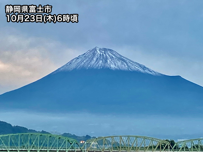 今日23日(木)は天気が回復傾向ですが、雲の多い空の下、静岡県や山梨県、神奈川県などから富士山の雪化粧リポートが相次いでいます。山頂から中腹にかけて白く染まった姿が雲間にのぞき、秋の深まりと冬の訪れを感じさせます。