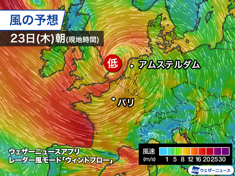 ヨーロッパの各地ではすでに平均で15m/s以上の風を観測していて、23日(木)の午後にかけては大西洋やイギリス海峡、北海沿岸などで20m/s以上の強風となる見込みです。内陸部でも風の吹き抜けやすい地形のエリアでは強風が予想されます。