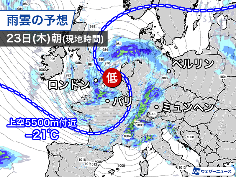 上空5500m付近で−21℃以下の寒気を伴った低気圧がイギリス海峡付近を通過しています。現地時間の23日(木)日中には中心気圧が970hPa台まで低下する予想です。