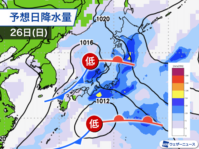 26日(日)になると南にのびる前線上に低気圧が発生する予想となっています。さらに別の前線が日本海から北日本方面に現れて、低気圧とともに東に進む見込みです。低気圧に向かっては南から暖かな空気が流れ込み、周辺では雨雲が発達しやすくなります。