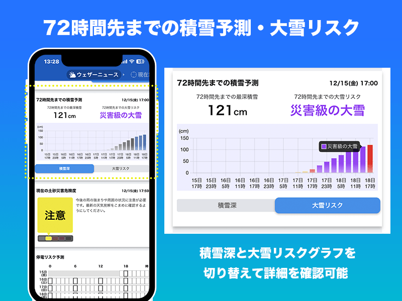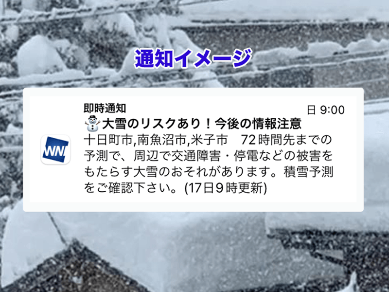 また、スマートフォン版では、6時間〜72時間先までの予測を対象とし、積雪予測から判定した大雪リスクが「雪害警戒」または「災害級の大雪」に悪化する場合にプッシュでお知らせします。