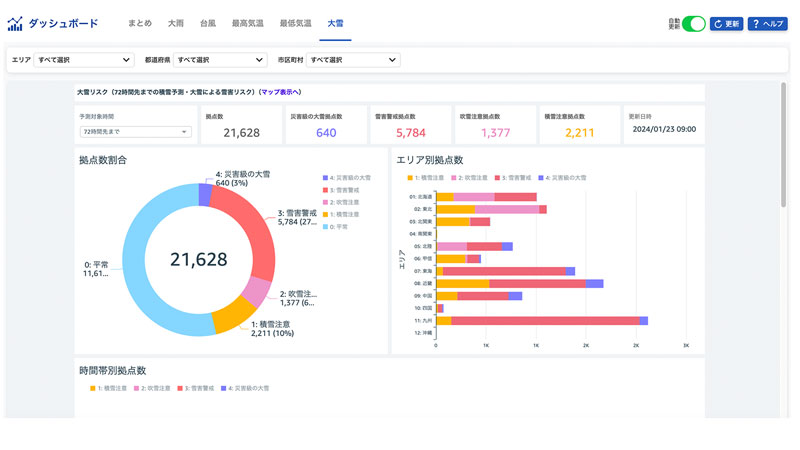 また、積雪量の増加傾向から、登録拠点周辺で交通支障や各種事故、停電などの生活・業務影響が発生するような大雪による雪害リスクを、5ランクに分けて表示します。ランクは「災害級の大雪」「雪害警戒」「吹雪注意」「積雪注意」「平常」の5つです。