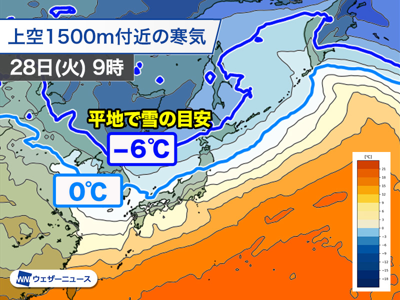 大陸からは高気圧が接近して、日本の周辺は28日(火)をピークに西高東低、冬型の気圧配置となる予想です。上空の強い寒気が南下し、平地でも雪を降らせる可能性がある上空1,500mで-6℃の寒気が道北付近、山沿いで雪を降らせる可能性がある0℃の寒気は北陸~山陰周辺まで南下します。