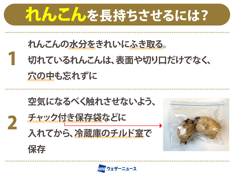 「れんこんの長持ちさせるには、まずれんこんの水分をきれいにふき取ることです。この水分とタンニンが反応して黒ずむので、切れているれんこんであれば、表面や切り口だけでなく、穴の中も水分をふき取るようにしてください。