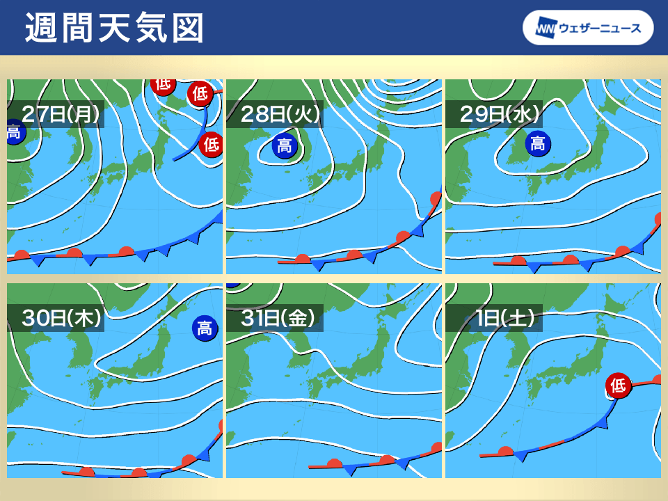 来週前半は北日本で雨や雪が降りやすくなりますが、東日本や西日本では30日(木)にかけて、高気圧に覆われて晴れる日が多くなる予想です。