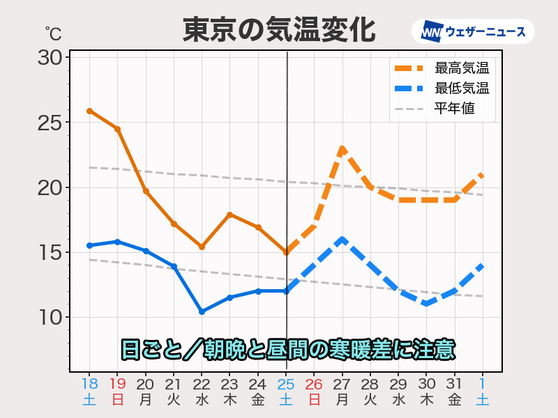 晴れる日の朝は放射冷却現象により、朝はグッと冷え込むと予想されます。朝晩と昼間の気温差にも注意してください。