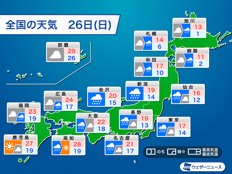 予想最高気温は札幌で14℃、東京で17℃、大阪で22℃、鹿児島で27℃です。雨が降る地域では実際の気温よりも寒く感じられるので、体調を崩さないように注意してください。