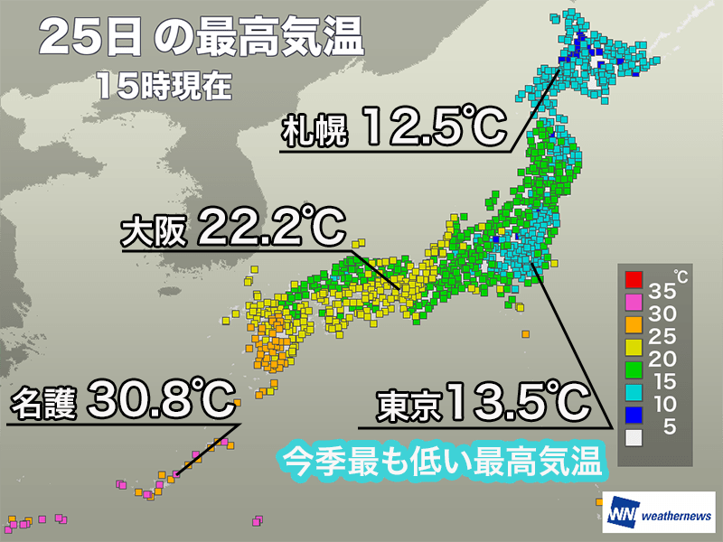 15時までの東京の最高気温は、12月上旬並みの13.5℃で、22日(水)に観測した15.4℃を下回って今季最も低い最高気温となっています。最高気温が15℃を下回れば14.1℃を観測した4月13日以来およそ半年ぶりです。