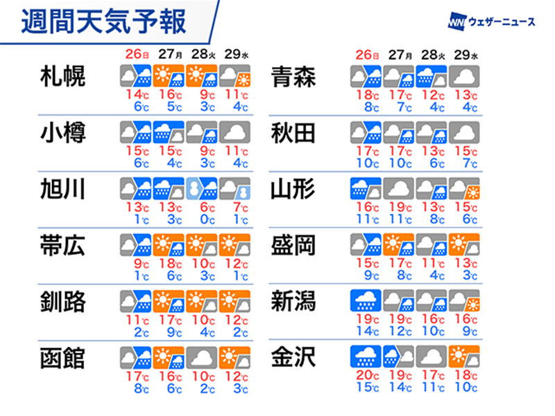 北海道沿岸部や東北日本海側・北陸では雨の予報ですが、大気の状態が非常に不安定になるため、雷雨や突風、降雹などシビアな現象に注意が必要です。