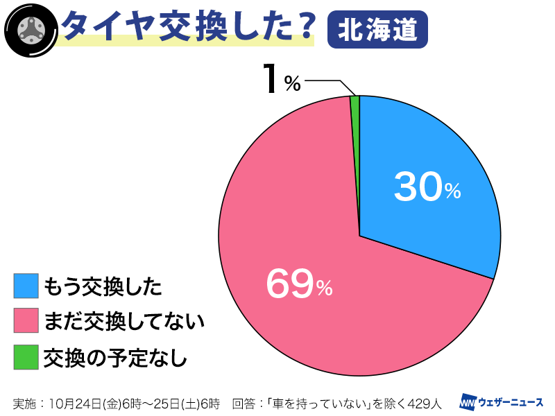 10月24日(金)~25日(土)にかけて、北海道のウェザーニュースアプリ利用者に対しタイヤ交換についてアンケートを実施しました。(回答数:429人)