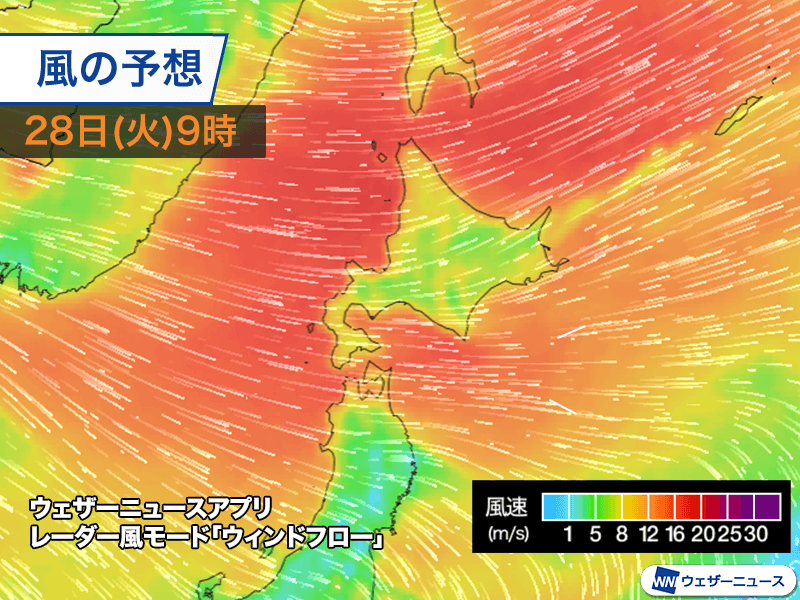 低気圧に近い北海道では沿岸部を中心に瞬間的に20m/sを超える暴風が吹き荒れるおそれもあり、暴風雨や吹雪に警戒が必要です。交通機関に影響が出るおそれもあるので、移動を予定している場合は最新の情報をこまめに確認するようにしてください。
