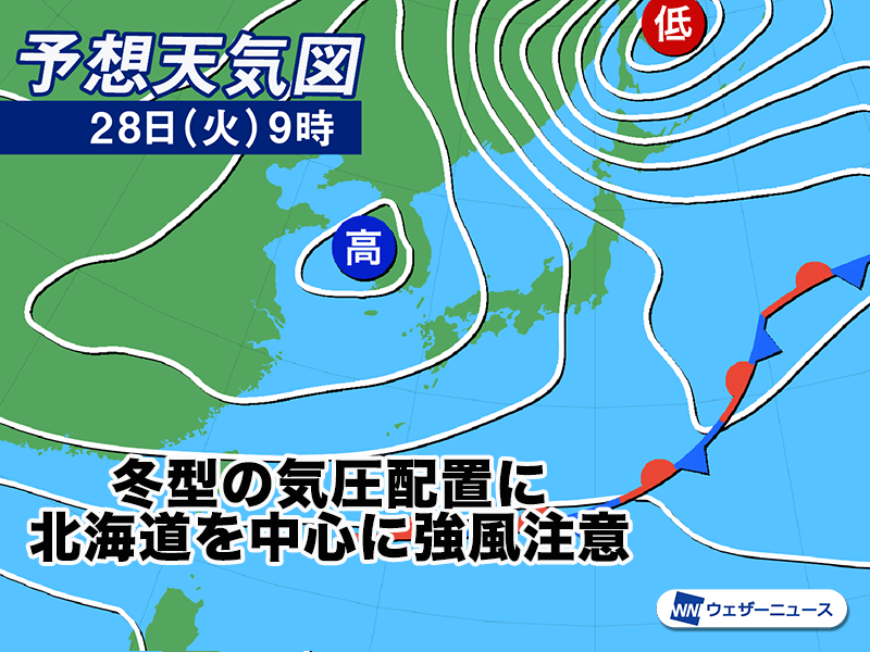 関東や近畿でも北寄りの風がやや強まる見通しで、風速の基準を満たせば「木枯らし1号」となる可能性があります。高気圧が張り出す29日(水)以降は徐々に荒天のピークを越える見込みです。