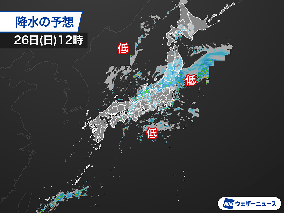 複数の低気圧や前線が日本列島周辺を進んでいて、これらの低気圧や前線に向かって南から暖かく湿った空気が流れ込み、雨雲が発生しています。