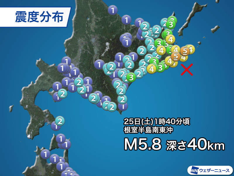 北海道で2年ぶりの震度5弱 根室半島南東沖でM5.8