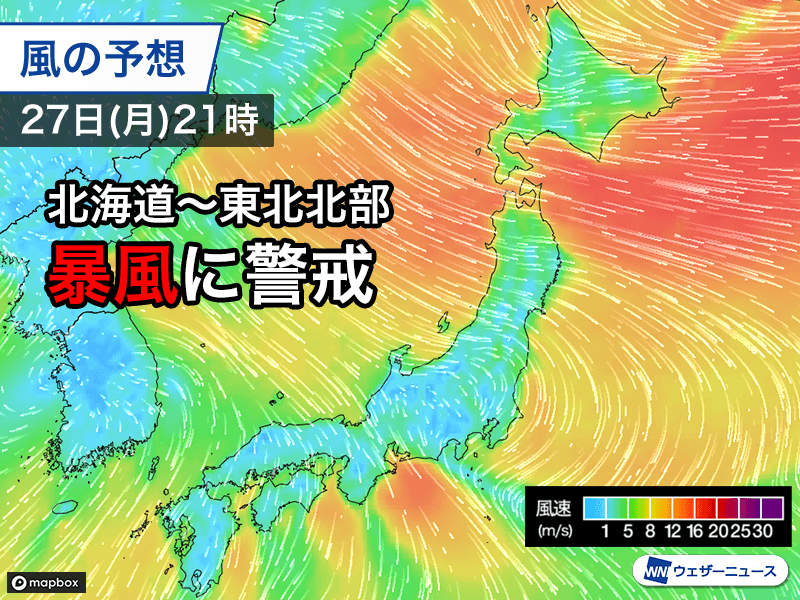 明日27日(月)は西高東低の冬型の気圧配置が徐々に強まり、上空の寒気が南下して北日本に流れ込みます。