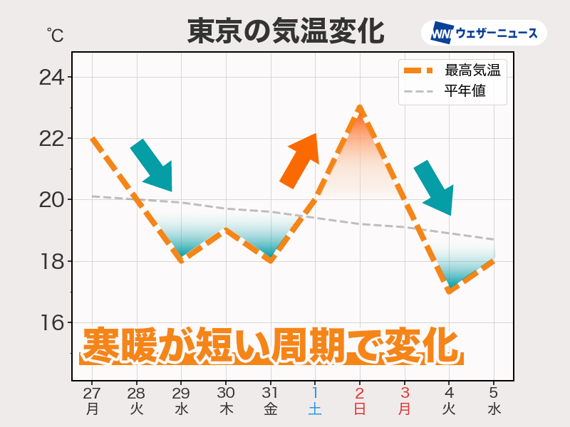 日毎の寒暖の変化が大きくなるので、体調を崩さないように注意してください。