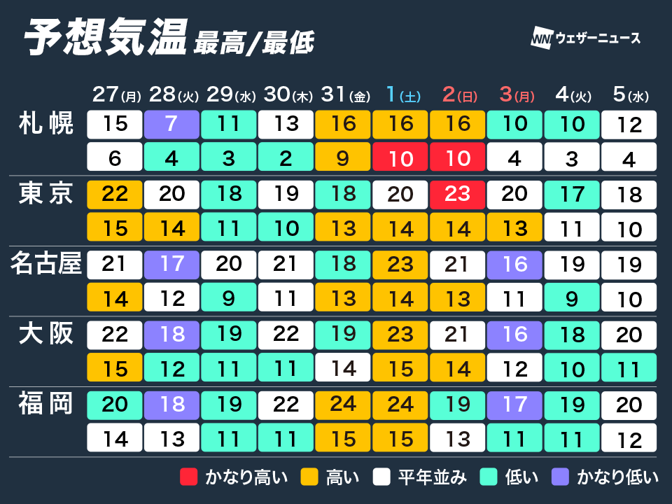 28日(火)の札幌の予想最高気温は今季最低の7℃、西日本でも最高気温が20℃を下回る地点が多くなります。
