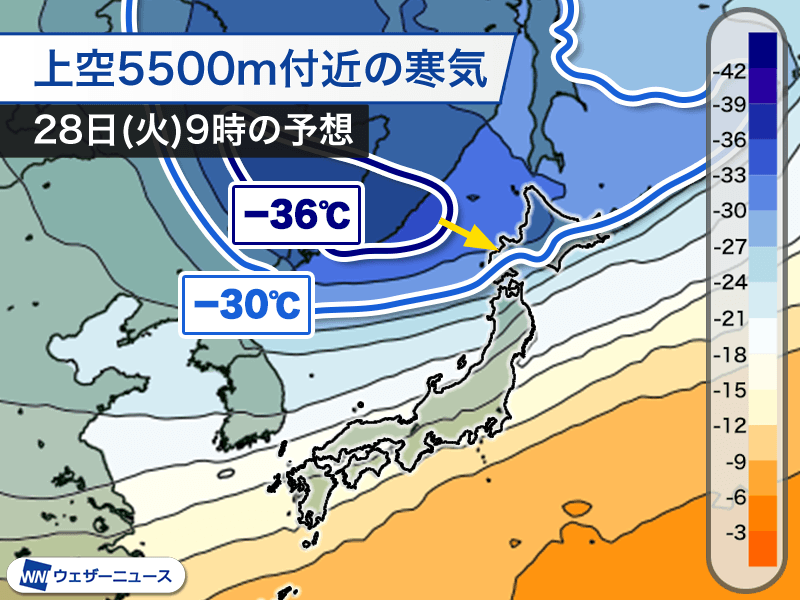 明日28日(火)にかけて、オホーツク海で低気圧が発達し、北日本を中心に冬型の気圧配置となります。道北付近には上空5,500m付近で−36℃前後のこの時期としては非常に強い寒気が南下します。