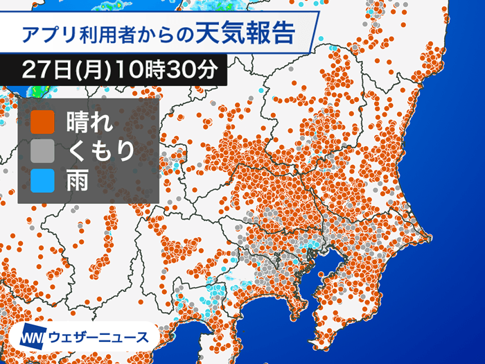今日27日(月)は低気圧や前線が離れ、冬型の気圧配置に変わってきています。関東の天気は回復傾向で、北部では晴れているところが多くなっています。