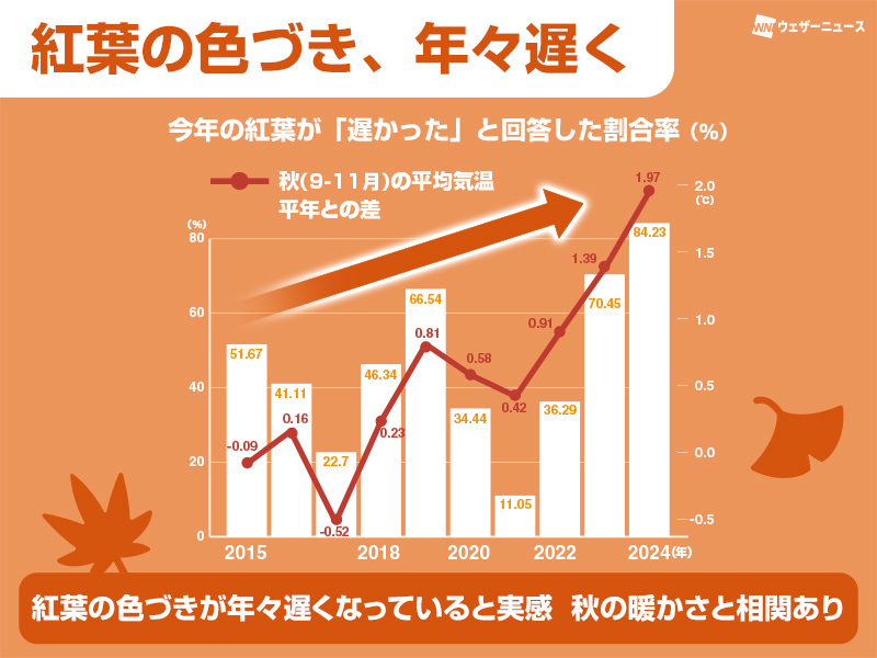 ウェザーニュースアプリ内で行った調査でも紅葉の色づきが遅くなっていることを実感していることがわかりました。