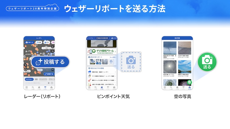 ※投稿フォームは「レーダーのリポートモード」(図の一番左)や「マイ天気」(図の真ん中)からも起動できます。
