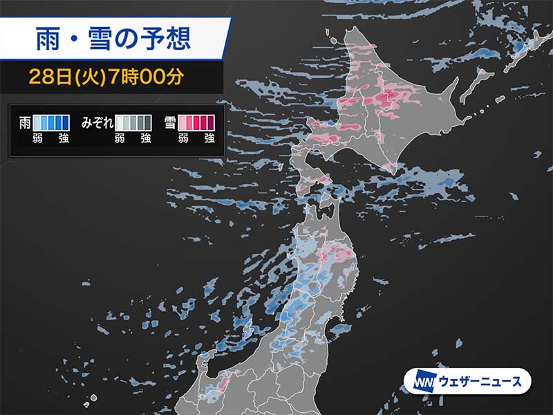 北海道の日本海側は雨や雪が降り、内陸部では平地でも雪の積もる可能性があります。路面状態の悪化にお気をつけください。風も強く、荒れた天気になる見込みです。